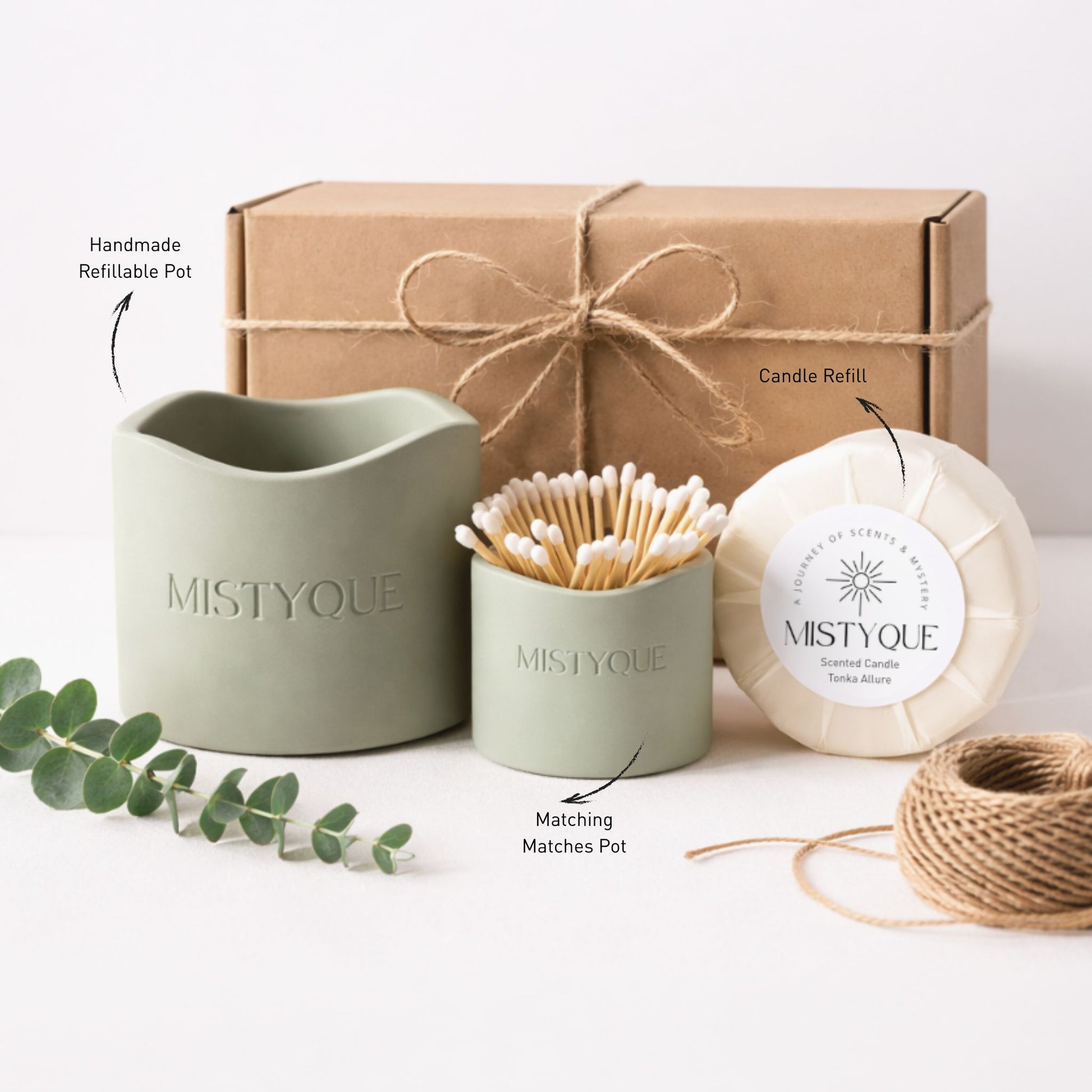 This set brings together our handcrafted concrete pot, one standard candle refill in your chosen scent, and a matching matches pot.